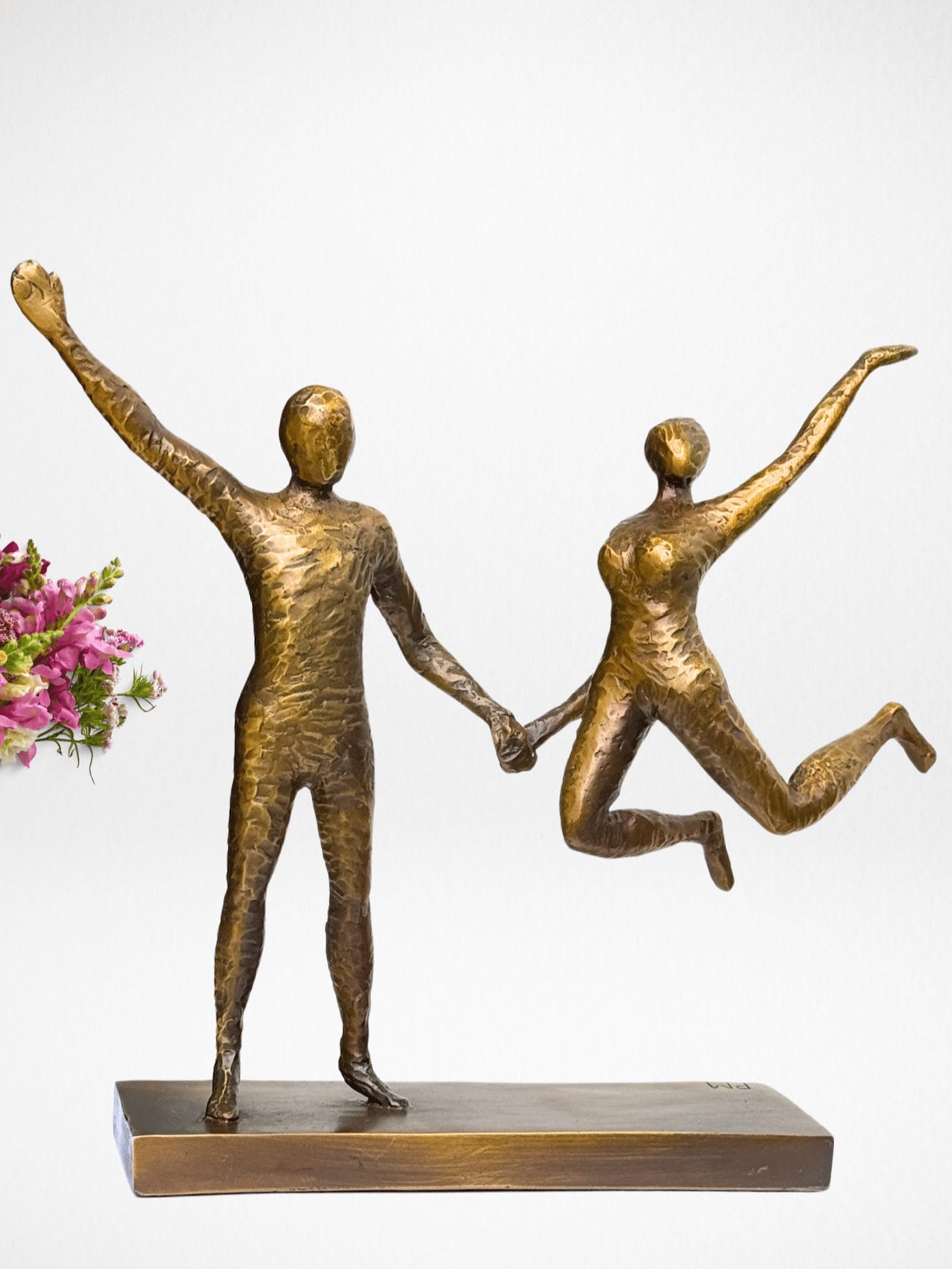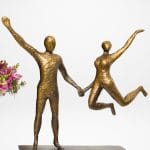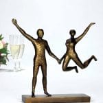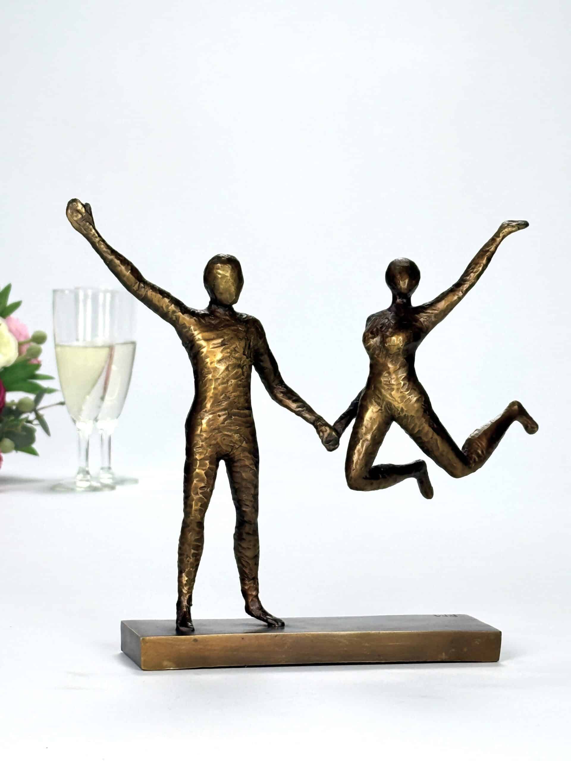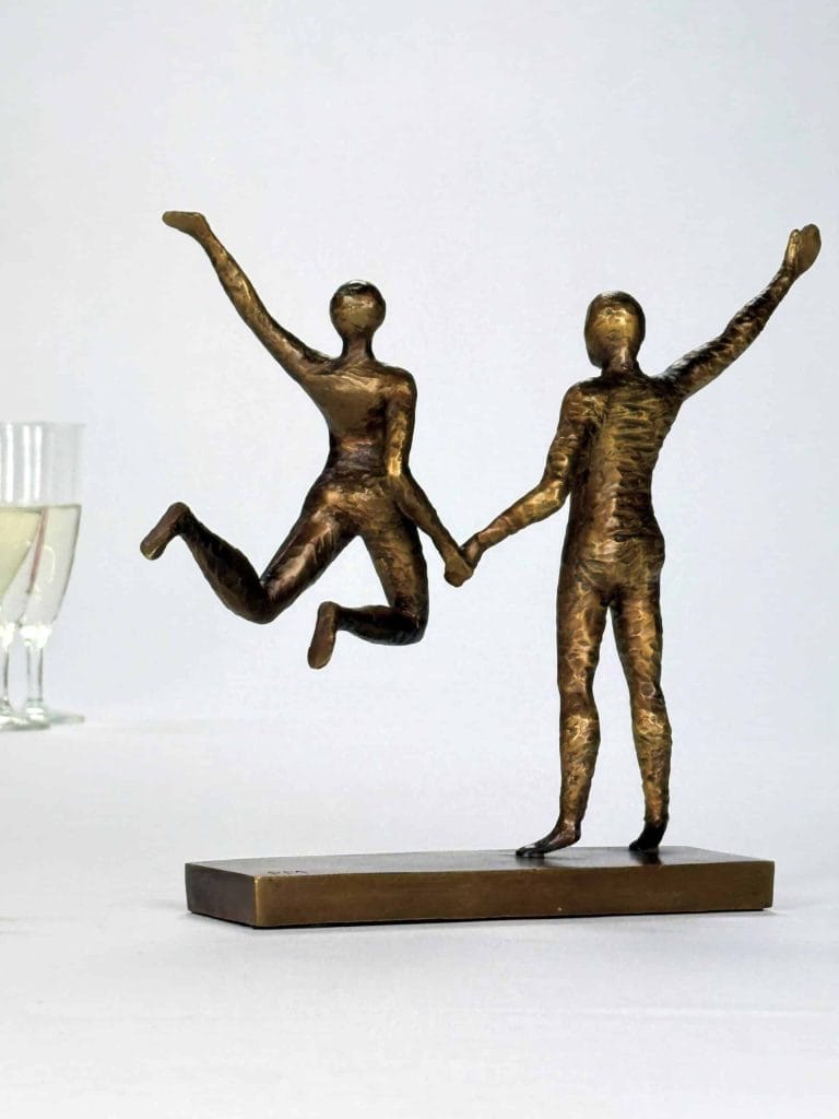 Skulpturen fanger et øyeblikk av ren livsglede – to mennesker i bevegelse, lette og frie, forbundet av et usynlig bånd.