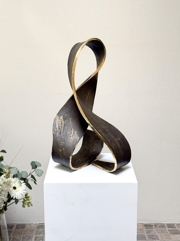 En eksklusiv bronseskulptur, der organiske former og elegant høyglanspolering skaper en illusjon av visuell letthet. Palle Mernild opphever metallens tyngde og forvandler det harde materialet til noe mykt og svevende.