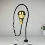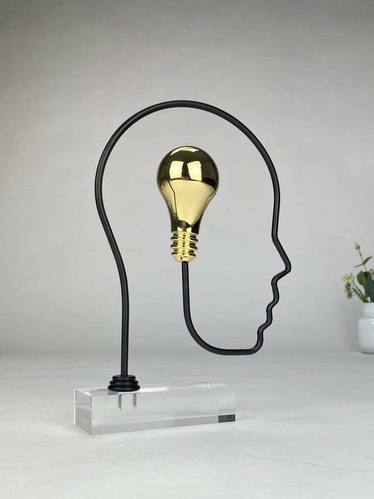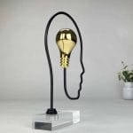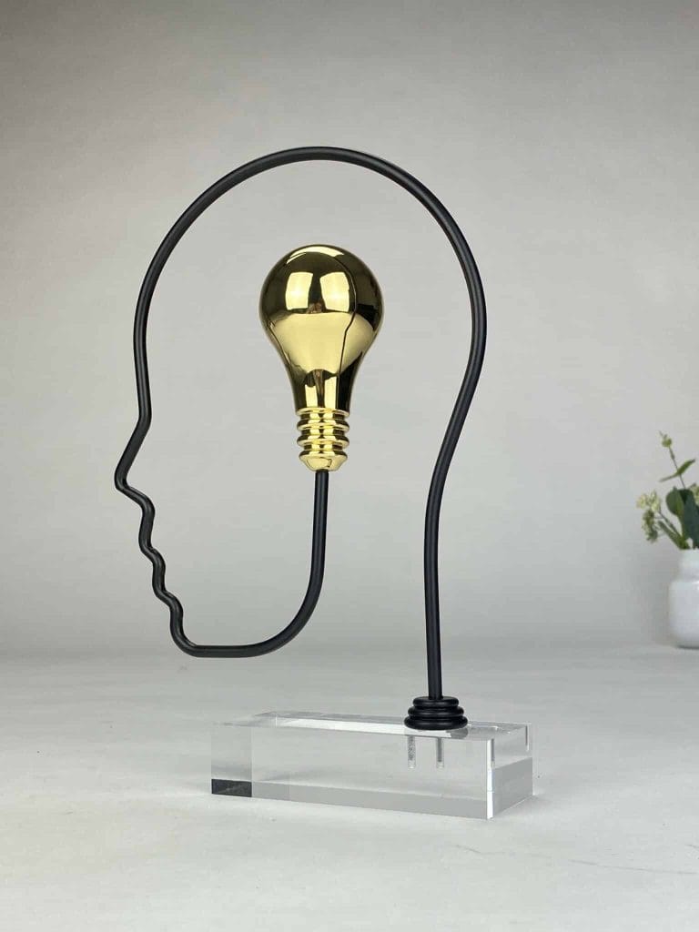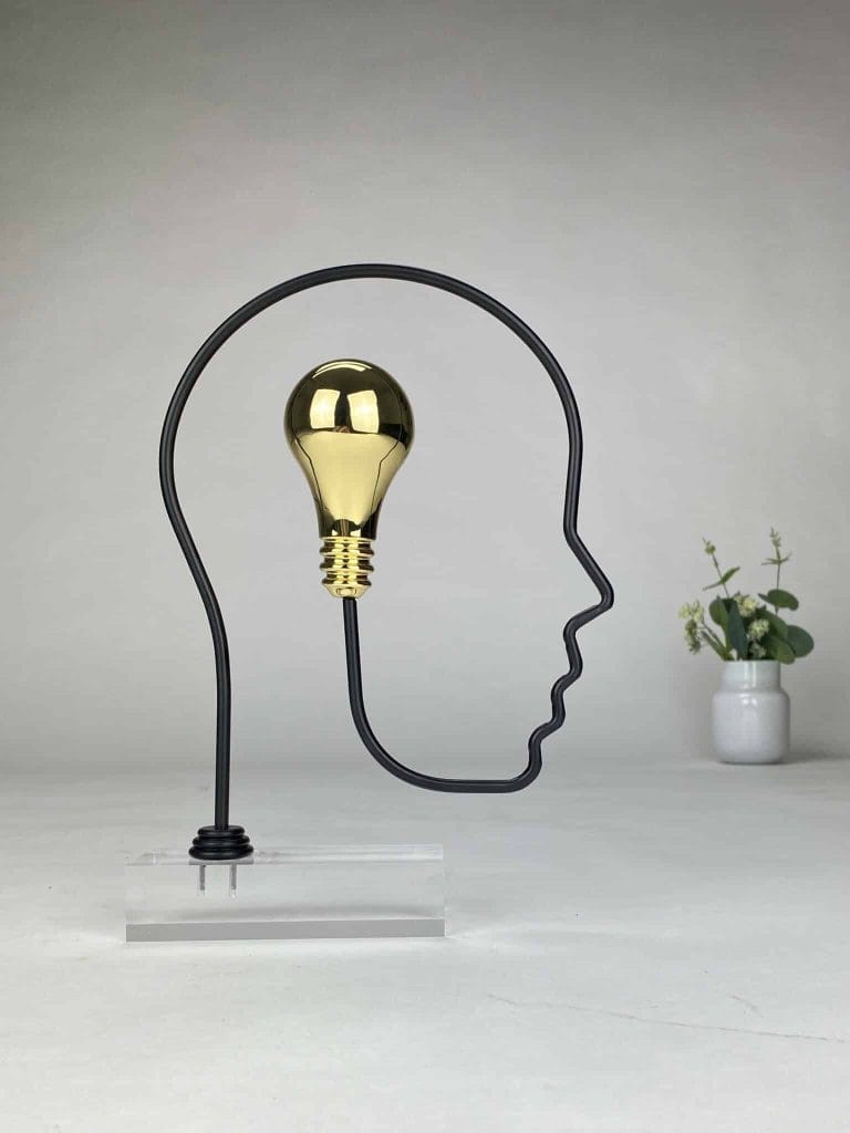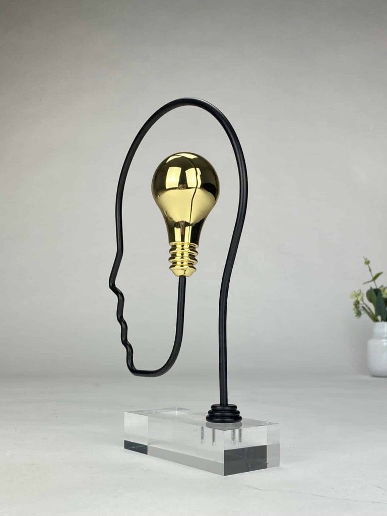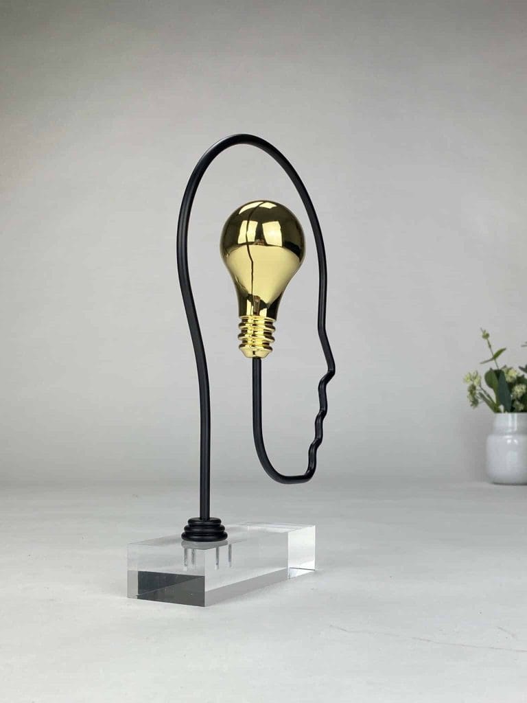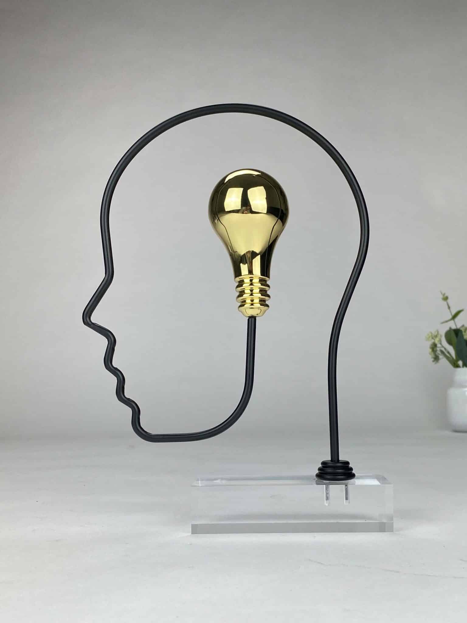 Skulpturen er utført i forgylt sink og sort premiumstål, montert på klar plexiglass, noe som gir et moderne og lett uttrykk.
